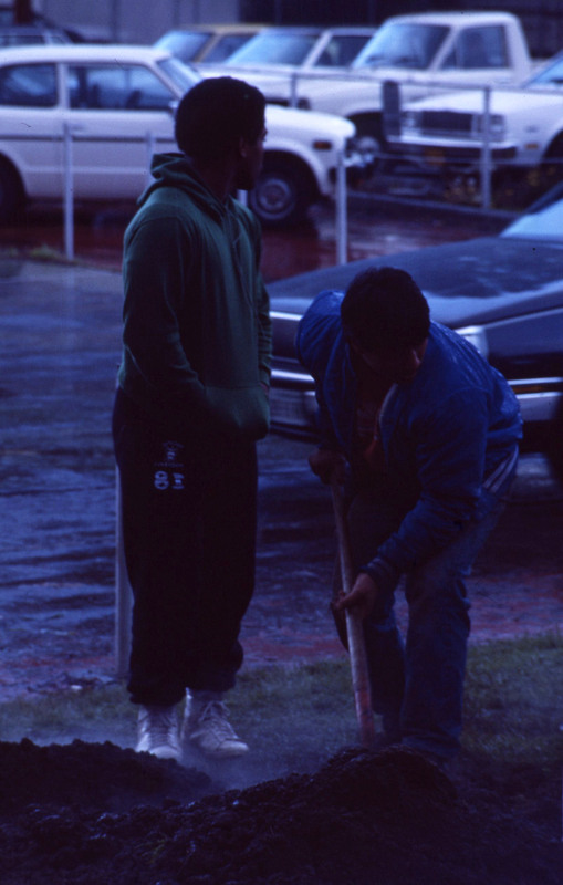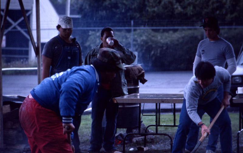 Students from Haumana O Hawai'i (Hawaiian Club) shovel coals for the kalua pig pit roast at Pacific University's annual Lu'au in 1986. It rained during the event that year.