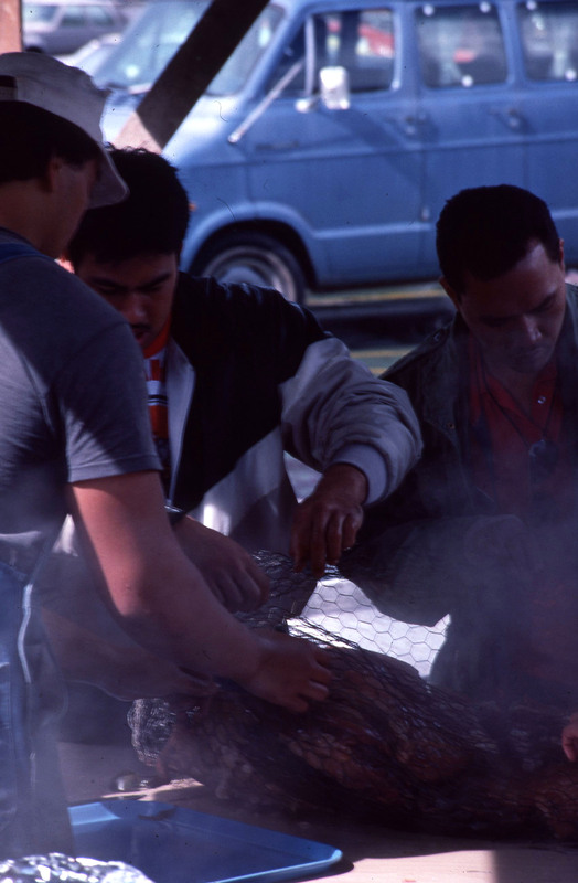 Several men assist with the cooking at Pacific University's annual Lu'au in 1986. They appear to be unwrapping something wrapped in chicken wire, most likely kalua pig, from the roasting pit.