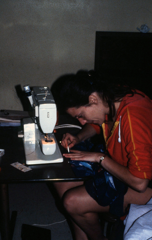 A woman performing a Maori-style poi ball dance at Pacific University's annual Lu'au in 1982. She is wearing a black sheath dress with a piupiu-style belt.