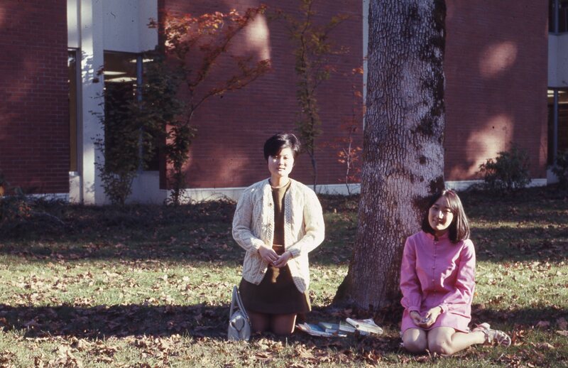 Students Anna Hisanaga (Class of 1972, wearing white) and Susan Kuioka (Class of 1972, wearing pink) sitting outdoors by Pacific University's Scott Library in the fall of 1970.