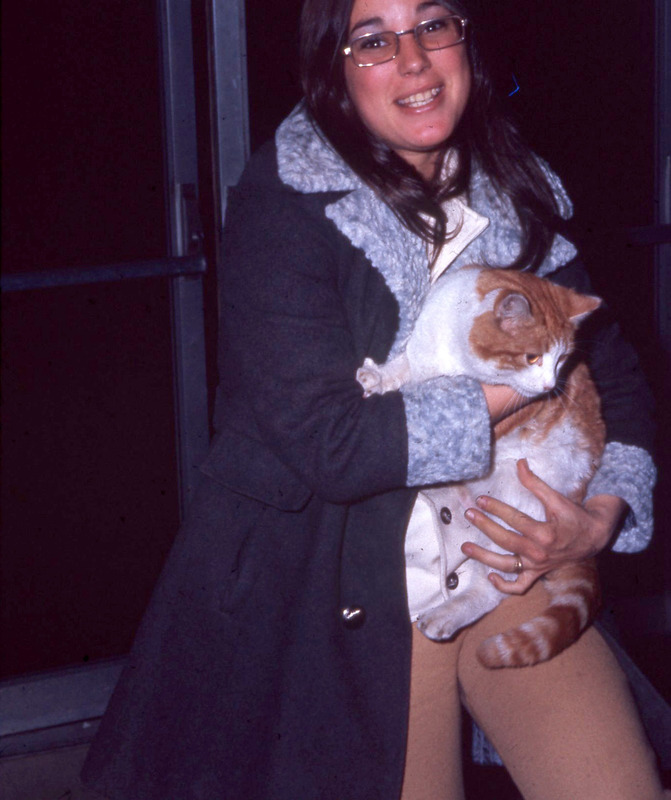 Pacific University student Liane Hirose (Class of 1971), walking on the Pacific University campus near Carnegie Hall in 1970, probably in late October.