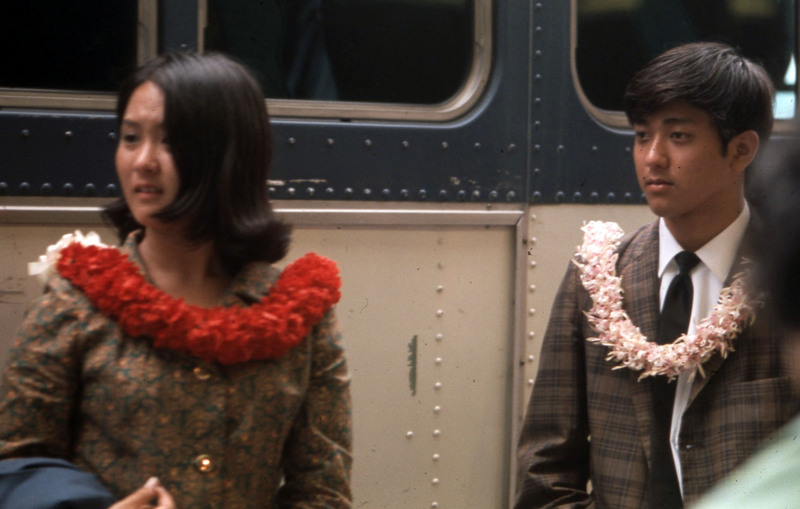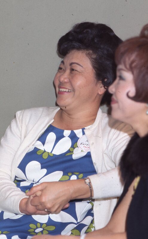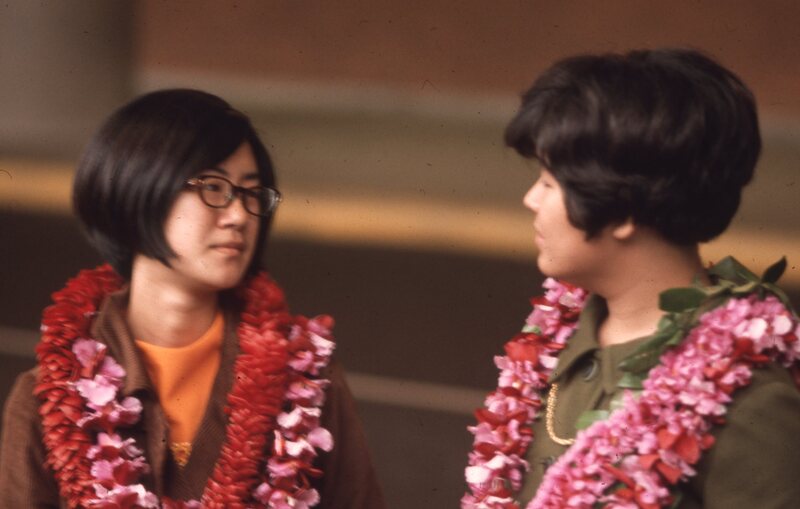 Two women attending Pacific University's annual Lu'au circa 1971. They identified on the original slide as "Parents, Kurahohu, Matsui." One is likely the mother of Jill Hiroko Matsui (Class of 1972).