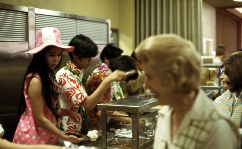 Pacific University students standing in the service line for the buffet at Pacific University's annual Lu'au, circa 1969-1970. A note on the original slide identifies several of the people in the image: Blaine Yata (Class of 1972), Sharon Nonaka (Class of 1974), and Roberta [Klenako?].