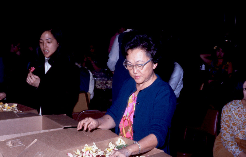Pacific University students stringing leis and/or decorations made of flowers and leaves during the university's annual Lu'au circa 1969-1970. Students' family members would ship fresh flowers and produce from Hawai'i via air to Oregon to be used at this event.