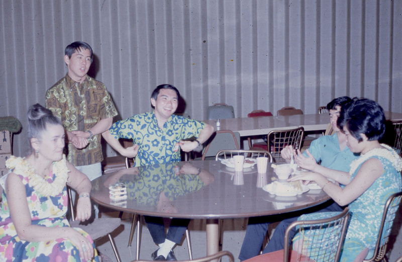 The dinner at Pacific University's annual Lu'au circa 1969-1970. This photograph was taken in Washburne Hall. The original slide is dark and underexposed.