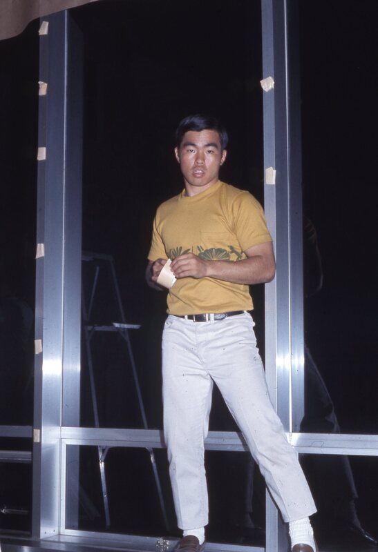 A male student stands by the windows of Washburn Hall during one of Pacific University's annual Lu'aus, probably in 1969 or 1970. Based on other slides found with this image, he was likely preparing to cover the windows with paper to black them out for the Lu'au performances.