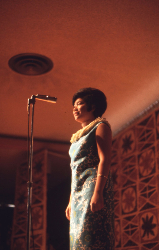 A woman wearing a blue and white dress and a lei, standing at a microphone on stage at Pacific University's annual Lu'au. This photograph was likely taken circa 1969-1970.