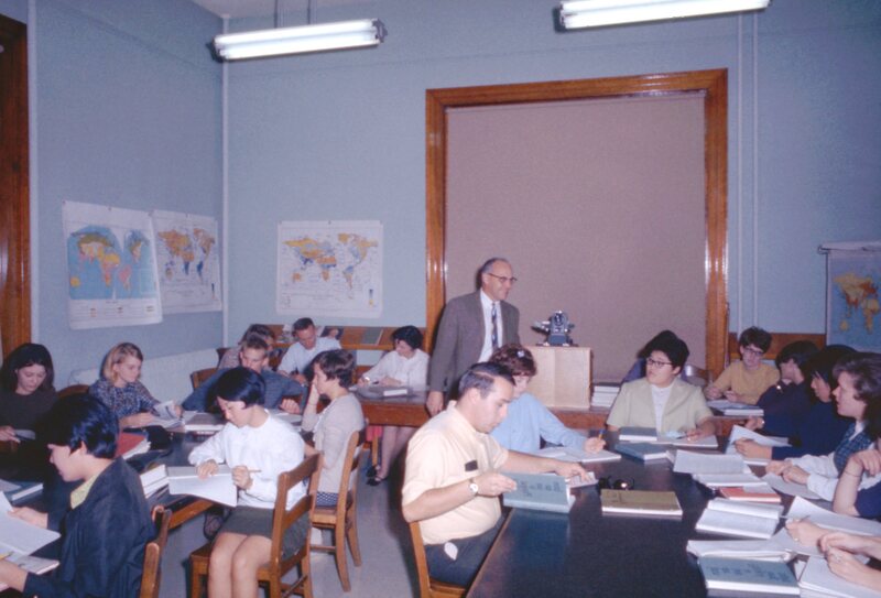A group of Pacific University students studying at tables with many books and papers set in front of them. A man, probably a professor, stands towards the back. A projector is on a podium and the window shade is drawn, indicating that they may have been watching a slideshow. The room resembles Pacific's Carnegie Hall before it was renovated. It might have been taken after the campus library was moved from Carnegie to Scott Hall, but before the ceiling heights were lowered in 1969. The original slide is dated 1967 in pencil.