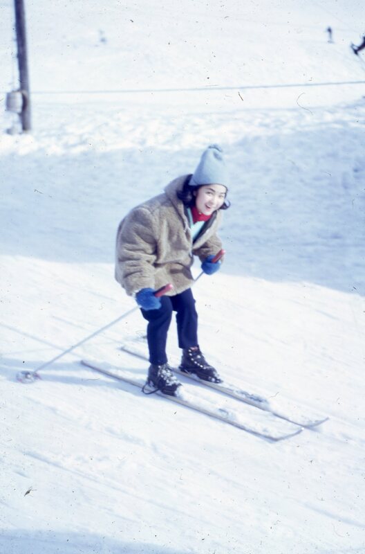 A Pacific University woman student skiing in 1968, probably at Mount Hood. Based on other related images, this may have been taken during a Haumana O Hawai'i (Hawaiian Student Club) outing.