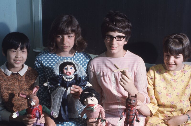 Four children holding marionette puppets, probably at an event hosted by Pacific University. Based on other photographs that appear to be related, they may have been attending a puppet show held on campus in the Spring of 1968.
