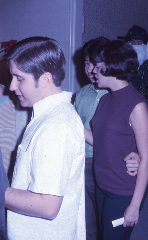 A group of Pacific University students, gathered around a piano in a private home. Based on context from other slides dating from this time period, this was likely a social event connected to Haumana O Hawai'i (Hawaiian Club), probably held at the home of one of its advisors, Professor Fred Scheller in Aloha, Oregon. The slide was printed in October, 1968.