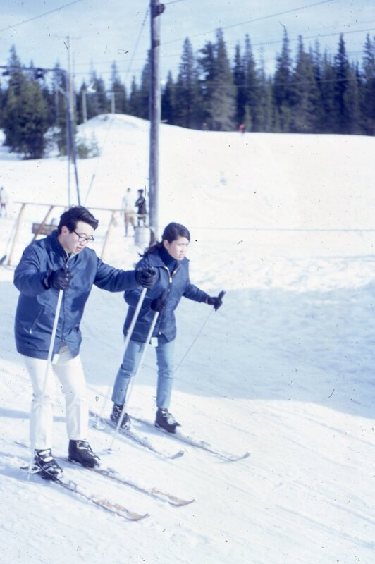 Two Pacific University students skiing in 1968, probably at Mount Hood. They are on a beginner's slope with a tow rope on the right. Based on other related images, this may have been taken during a Haumana O Hawai'i (Hawaiian Student Club) outing.