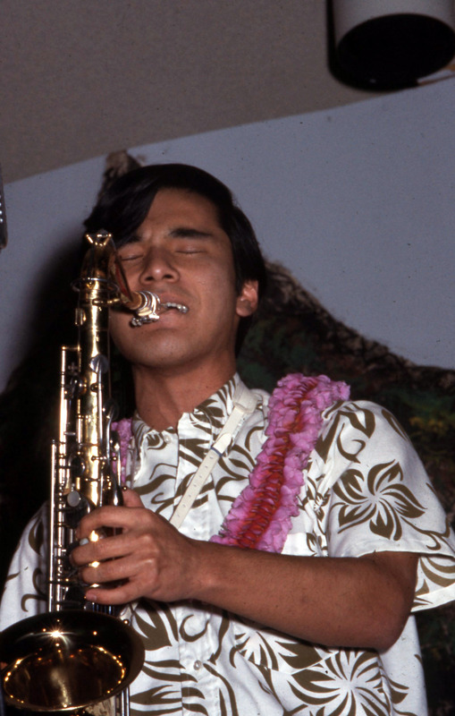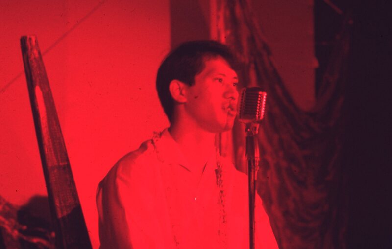 A man, probably a Pacific University student, speaking at a microphone during Pacific University's annual Lu'au in 1968. He may have been an announcer or emcee for the event.
