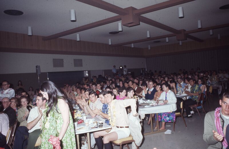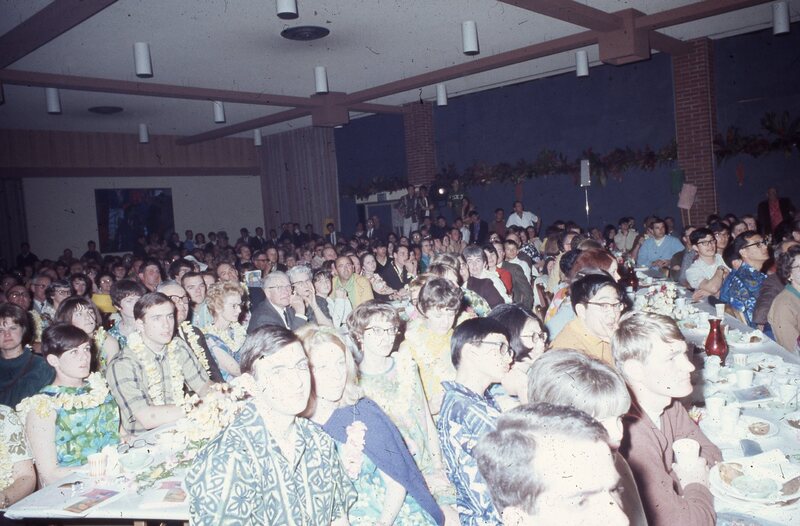 A wide view of the audience in attendance at Pacific University's annual Lu'au in 1968. Many of those present were students; others include the families of the Lu'au performers, university staff and local community members. Much of the audience is dressed for the occasion in colorful aloha shirts, muumuus, and leis. The remains of the kalua pig dinner that was served at each Lu'au are on the tables. This photograph was taken in Washburne Hall.