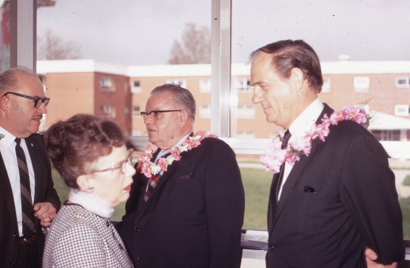The actor Karl Malden and several other guests at the annual Lu'au at Pacific University. They are standing by the north windows of Washburne Hall, with Clark Hall in the background. Malden served as a visiting professor at Pacific University in 1966-67. Note: The original slide is stamped with the processing date "Mar 1970," but because Lu'au always occurred in April, this was likely a reprint of an earlier negative from April 1967.