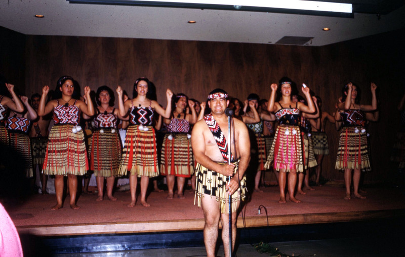 A male performer at a microphone, standing in front of a group of Pacific University students and parents, who are performing a Maori-style dance in October, 1967. A note on the back of a matching slide identifies this event as having occurred at a "Frosh Dance" on campus. The dancers are wearing piupiu skirts. The performance was likely organized by the students' Hawaiian Club, Haumana O Hawai'i.