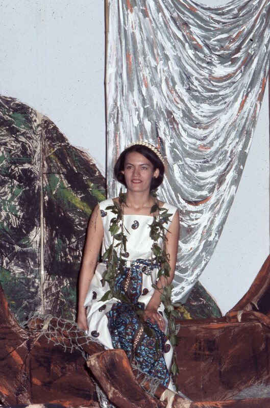 Female Pacific University students and parents performing a Maori-style dance in October, 1967. A note on the back of a matching slide identifies this event as having occurred at a "Frosh Dance" on campus. The performance was likely organized by the students' Hawaiian Club, Haumana O Hawai'i.