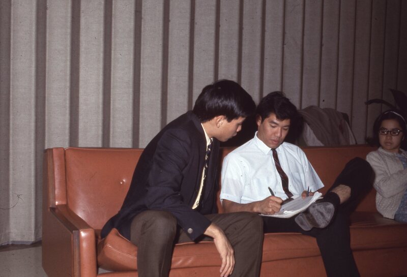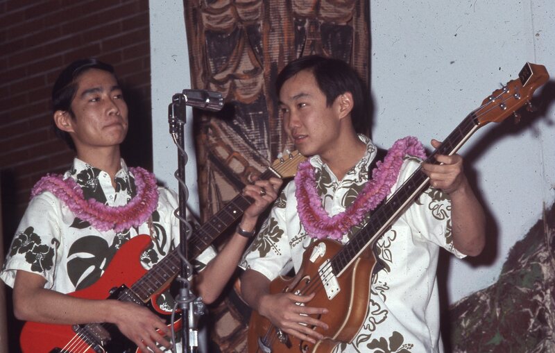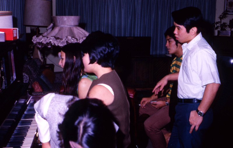 Members of Pacific University's Haumana O Hawai'i club gathered around a piano, singing while one student plays. This was taken in December 1968, probably at a Haumana O Hawai'i (Hawaiian Club) holiday event; they may be singing Christmas carols.