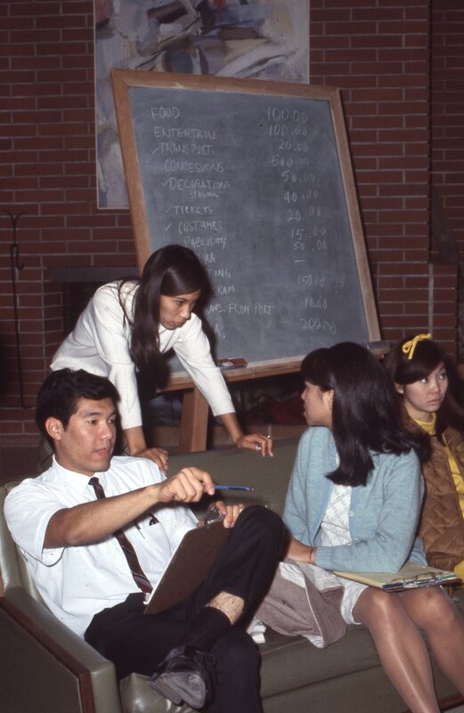 Students and/or volunteers from Pacific University's Haumana O Hawai'i (Hawaiian Club), backstage at the university's annual Lu'au in 1968. Club members organized and performed in the Lu'au. The chalkboard behind them tracks expenses for the event, including costs for transportation, publicity, concessions, food, costumes, and so on.