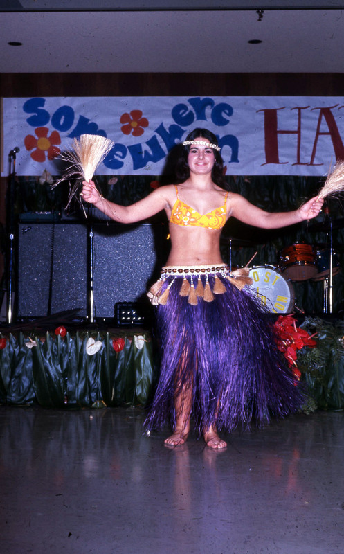 Pacific University student Wanda Fountain (Class of 1974) performing at the 1970 Haumana O Hawai'i Homecoming Dance. She is wearing a Tahitian-style costume with a grass skirt. Musicians are visible in the background.