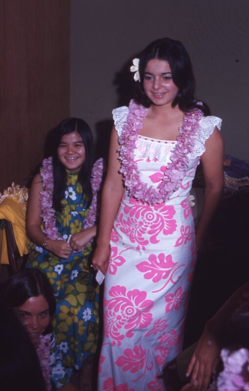 Pacific University student Jill Matsui (wearing red, pink and orange dress), who had just been crowned Homecoming Queen, on stage at the Haumana O Hawai'i Homecoming Dance in October, 1970. She is flanked by the women who had been elected members of her "Court", including: Marcia Englund; Linda Jenkins (wearing dark orange and black); Mary Ann Lazelle; and Lynette Sites. Attendants who were members of Haumana O Hawai'i (Hawaiian Club) stand behind them. A banner announcing the theme of the dance performance, "Somewhere in Hawaii", hangs in the background.