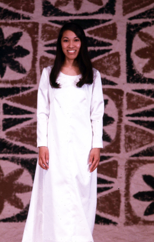 Pacific University student Mia Akau performing at the 1970 Haumana O Hawai'i Homecoming Dance. She is wearing a Tahitian-style costume with a purple grass skirt.