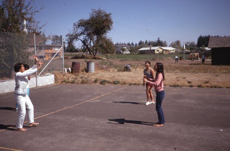 Pacific University students playing volleyball in 1970. A note on the original slide identifies them as: Oveta Puaa; Juanita Chang; and Mia Akau. This picture was probably taken during an event organized by Haumana O Hawai'i (Hawaiian Club).