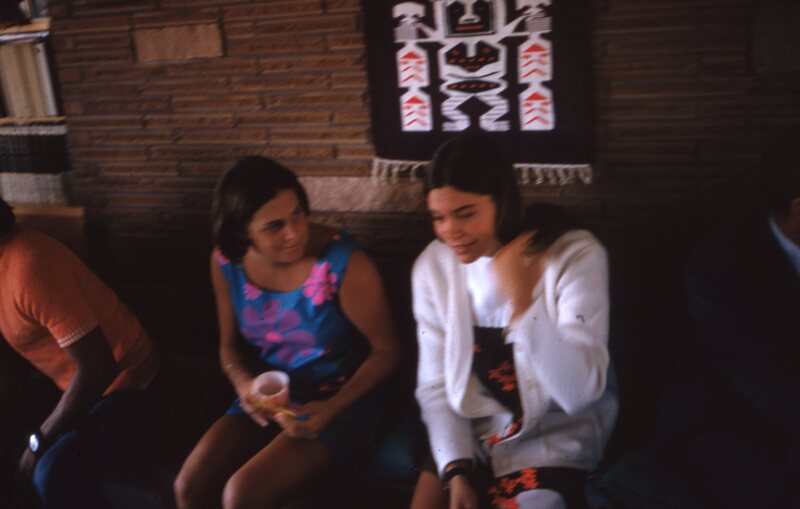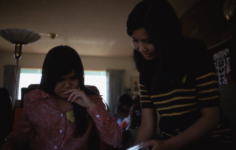 Sharon Kodani and Lenore Uchimura, two members of Pacific's Haumana O Hawai'i (Hawaiian Club), socializing in 1970. This photograph was likely taken during a club meeting or event.