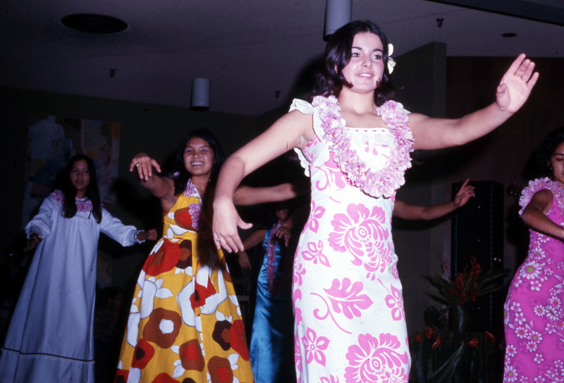 Pacific University women students performing a dance at the 1970 Haumana O Hawai'i Homecoming Dance . They are identified on the original slide as: Mia Akau, Wanda Fountain, Bobbi Rapozo and Colleen Keliikoa.