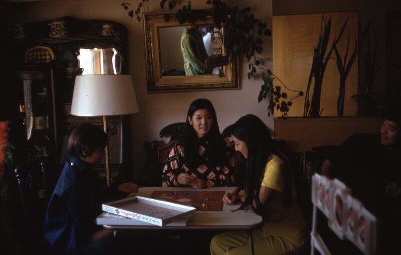 Pacific University students, all of whom were part of Haumana O Hawai'i (Hawaiian Club), playing the board game "Aggravation" in 1970. A note on the original slide identifies them as: Rene Akiyama; Marge Teruya; Sue Uyetake; and Carl Itamura. This photograph was likely taken during a club meeting or event.