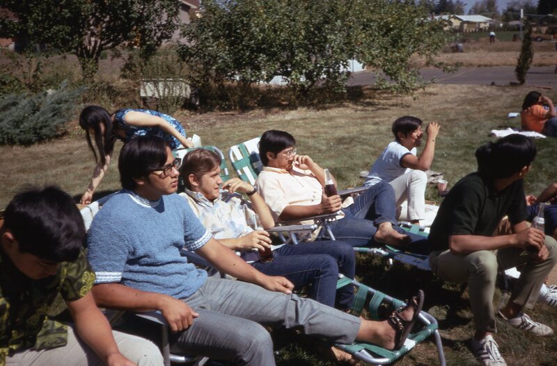 Pacific University student James Nakamura (Class of 1972), lying on a mat outdoors on the university's campus in the Fall of 1970. He is at a social event hosted by Haumana O Hawai'i (Hawaiian Club).
