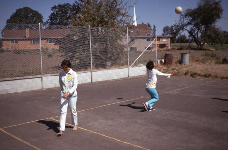 Pacific University students playing volleyball in 1970. A note on the original slide identifies them as Oveta Puaa and Colleen Keliikoa. This picture was probably taken during an event organized by Haumana O Hawai'i (Hawaiian Club).