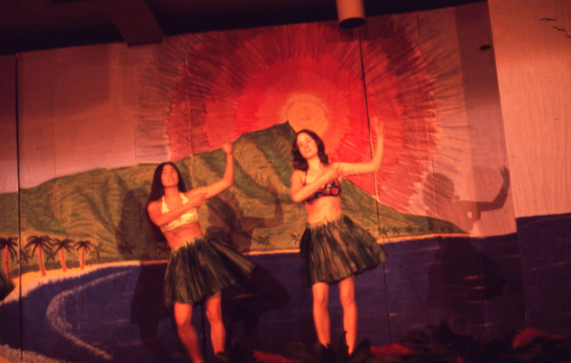 A group of women students performing a Tahitian-style dance on stage at Pacific University's annual Lu'au in 1975. Two are wearing Tahitian-style grass skirts and holding grass hand tassels; the other two are wearing matching bikini tops and skirts. The photographer, Peg Osland, was on the staff of Pacific's publicity department.