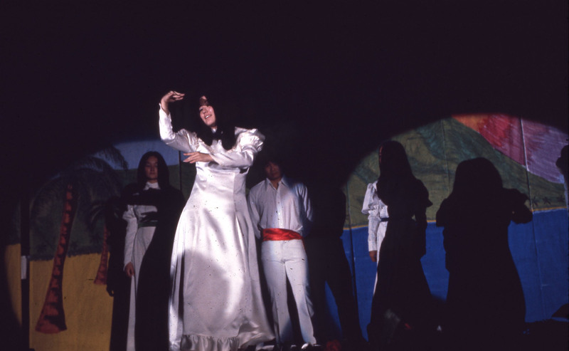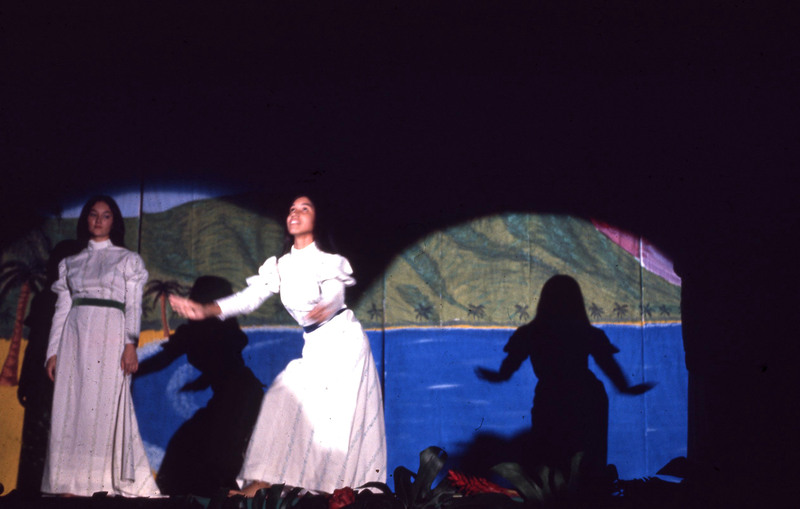 A Pacific University student in a white satin dress, dancing on stage at the university's annual Lu'au in 1975. She was likely performing as the "Queen" of the Lu'au; this role usually donned a similar white dress and performed a special dance. The women in the back were likely "Princesses," each of whom represented a different island.