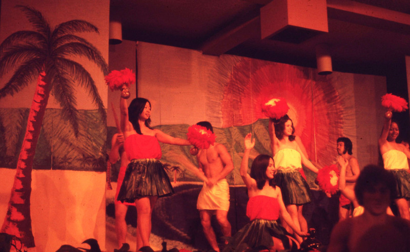 Pacific University students performing while wearing ti leaf skirts on stage at the university's annual Lu'au in 1975. The photographer, Peg Osland, was on the staff of Pacific's publicity department.