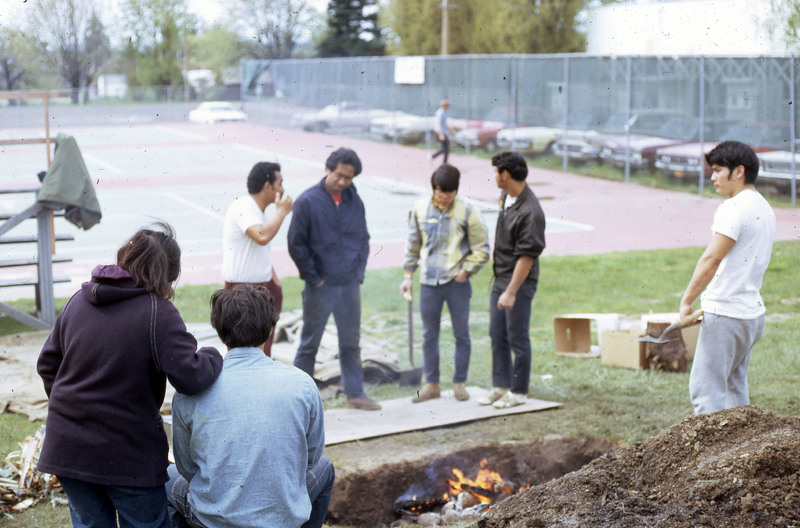 A group of students and/or family members tend the kalua pig pit roast at Pacific University's annual Lu'au in 1972. Tennis courts are visible in the background.