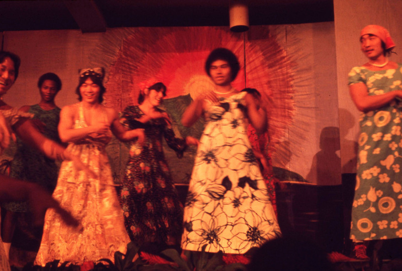 Male Pacific University students performing in drag on stage at the university's annual Lu'au in 1975. The photographer, Peg Osland, was on the staff of Pacific's publicity department.