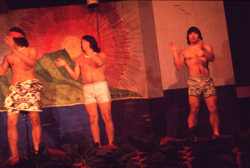 Several male Pacific University students performing on stage at the university's annual Lu'au in 1975. The photographer, Peg Osland, was on the staff of Pacific's publicity department.