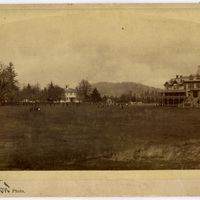 Panoramic photograph of the Pacific University campus, showing the principal buildings as they stood in 1887 before Marsh Hall was built. From left to right, the large buildings are: Old College Hall (which is now in a different location); Academy Hall (burned in 1910); Herrick Hall (the first girls' dormitory, burned in 1906). Students or faculty stand in the field between the buildings, and David Hill appears in the background. This photograph was taken by a travelling photographer from the I.G. Davidson Studio, based in Portland.