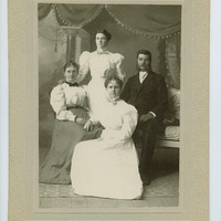 A portrait of Levi and Belle Walker and their daughters Leva and Elda, probably taken around 1901. The Walkers were a prominent family in Forest Grove, Oregon, that had helped to found Pacific University. Levi's parents, Elkanah and Mary Richardson Walker, were two of the earliest missionaries in the Oregon Territory, having arrived in 1838 and founding a mission among the Spokane. Many members of their extended family were involved in missionary and educational work. Levi and Belle, who were both graduates of Pacific University, worked at the Forest Grove Indian Training School in the 1880s. This portrait was probably made around the time when the two daughters, Elda and Leva, graduated from Pacific. They would go on to earn Ph.D.'s. The sisters became professors of botany at the University of Nebraska.