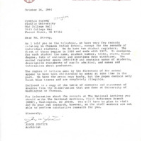 Letter from the National Archives to Cynthia Straughn, a Pacific University student who was researching the Indian Training School. The letter describes student rosters and mentions that other records pertaining to the school were destroyed by water damage.