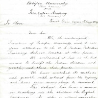 A draft of a letter from trustees of Pacific University in support of keeping the Indian Training School in Forest Grove. This draft is not addressed, but the letter was probably sent to the United States Secretary of the Interior. It describes the accomplishments of the school so far, including the teaching of English (noting 'no other [language] is allowed among them'), Christianization of the students, and vocational training. The draft names five of the eleven members of the Board of Trustees as signatories: Alanson Hinman, Horace Lyman, George H. Atkinson, Obed Dickinson, and G. H. Collier.