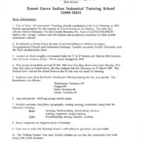 Fact sheet by former Pacific University archivisit Rick Read about the Forest Grove Indian Training School. It includes basic facts about the school, such as its location, important dates, and enrollment figures.