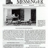 A news article advertising a presentation on the Indian Training School by Pacific University alumna Cynthia Straughn in 1992. Straughn's research led to the inclusion of several copies of documents being added to the Indian Training School Collection at Pacific. Note that the caption for the image in the article identifies the white man as Samuel Walker; this may not be correct. The article appeared in a newsletter, the 'Old College Hall Messenger,' which was issued by the Pacific University Museum.