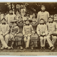 - A group portrait of students from the Umatilla tribe at the Forest Grove Indian Training School. The students are probably those who arrived as a group from Umatilla lands in October 1881: Haley (or Hallay) George; Emma Winnum; Tina Lowry; Winnie Abrahams; Albert John; Charley Wilhelm; William Barnhart; Moses Price Minthorn; Hugh [Minthorn?]; and Roy Cook. The caption notes that this was number 35 in a series of photographs by I.G. Davidson, a photography studio based in Portland. The photograph is one of several group portraits of students at the school, which were intended to demonstrate how the school dressed the students and taught them to behave according to the norms of white society.