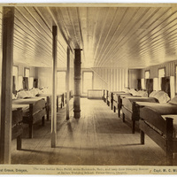 - A view of the boy's dormitory in the Forest Grove Indian Training School. The caption notes that this was number 64 in a series of photographs by I.G. Davidson, a photography studio based in Portland. The building and the furniture in this image were constructed by the boys who lived there. The girls at the school sewed the bedding and the uniforms that are hanging on the walls. The photograph was probably intended to show how the students at the school were being taught practical trades and the manners of white society. The picture most likely dates from 1881 or 1882.