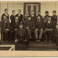 - Group portrait of fifteen men and women who were associated with the Indian Training School in Forest Grove. They are sitting in front of one of the buildings used by the school. Most of those depicted were probably teachers and staff members. A note on the back of the photograph identifies the man sitting on the center of the steps as Samuel A. T. Walker, who was the school's shoemaking instructor. The man in the lower left hand corner is Dr. Henry Minthorn, who served as the school's superintendent from 1883-1884. The woman resting a hand on his shoulder is probably his wife, Laura E. Minthorn. The Native man on the right may be David Brewer, who served as the school's disciplinarian. The Native women in the back were probably students who were serving as the girls' workshop leaders. They may include Katie Loulin Brewer, Emma Kahama, Lillie Pitt, Jennie Fletcher, or others.