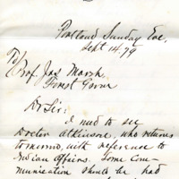 Portland, Sunday Eve.<br/>Sept 14 [18]79<br/>To Prof Jos Marsh,<br/>Forest Grove<br/>Dear Sir:<br/>I need to see Doctor Atkinson, who returns tomorrow, with reference to Indian Affairs. Some communication should be had as soon as possible with the Secretary of the Interior. <br/>The daughter of my late landlandy will return from San Francisco on Tuesday evening. I must see her with relation to [unmaking?] up my home here.<br/>Wednesday evening General Howard's daughter Gracie is married, of course my duty is placed here.<br/>I intend to ride out on Tuesday for drill; then on Tuesday, THursday & Friday we will have the regular drills.<br/>Truly yours,<br/>M.C. Wilkinson<br/>U.S.A.<br/>P.S. Am writing by a faint light & late. Please excuse careless appearance of note. M.C.W.
