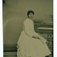 - Portrait of an unidentified Native American woman. She is sitting in front of a painted studio backdrop of a piano, and is holding a magazine or newspaper. She was likely a former student at the Forest Grove Indian Training School. The choice of props may have been intended to symbolize her education in reading and music. The back of the photograph includes a handwritten note by the subject, describing herself as an 'ugly girl' who worked hard, did dress-making, and was a musician. The note may have been addressed to Minerva 'Minnie' J. Walker, whose husband Samuel was the shoemaking instructor at the school (see a similar inscription on the back of another photograph, PUApic_008315). The photograph is a tintype, a format that was uncommon by the late 1880s, but which was cheap and easy to send in the mail.