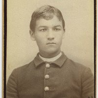A portrait of an unidentified Native American boy. He probably attended Chemawa School and/or the Indian Training School at Forest Grove. He is wearing the military-style school uniform used at Chemawa. The photograph is a small, 85mm x 185mm image in carte-de-visite format. It is stamped and dated on the verso of the photograph as having been taken by W. P. Johnson of Salem in October, 1887.